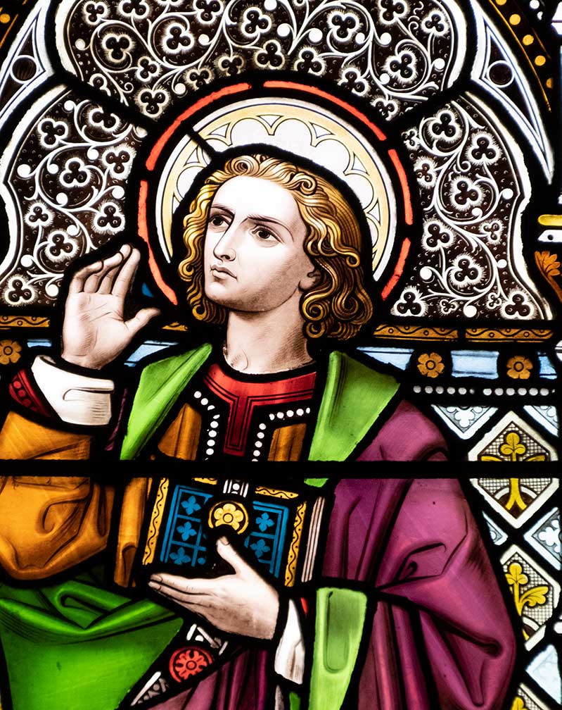Memorial window for Elizabeth Dunn who left £2,000 in her will for the building of the tower and steeple. The centre light shows the Crucifixion with Mary on one side and Saint John on the other.
