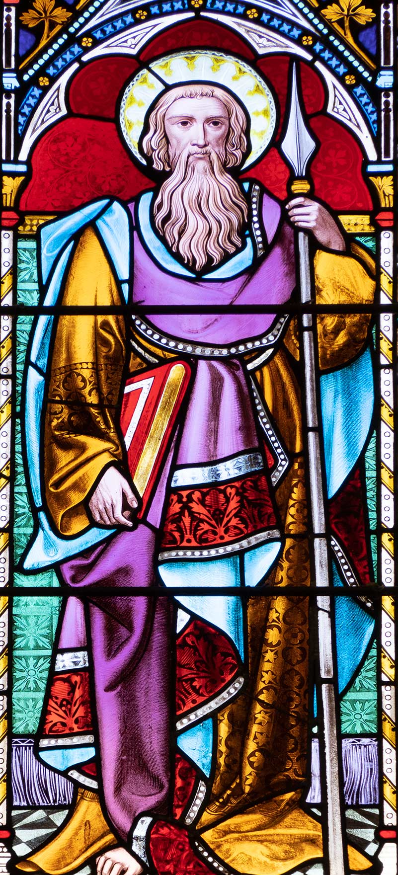 St Thomas is shown with a spear which alludes to his martyrdom when he was stoned and then run through with a spear.
